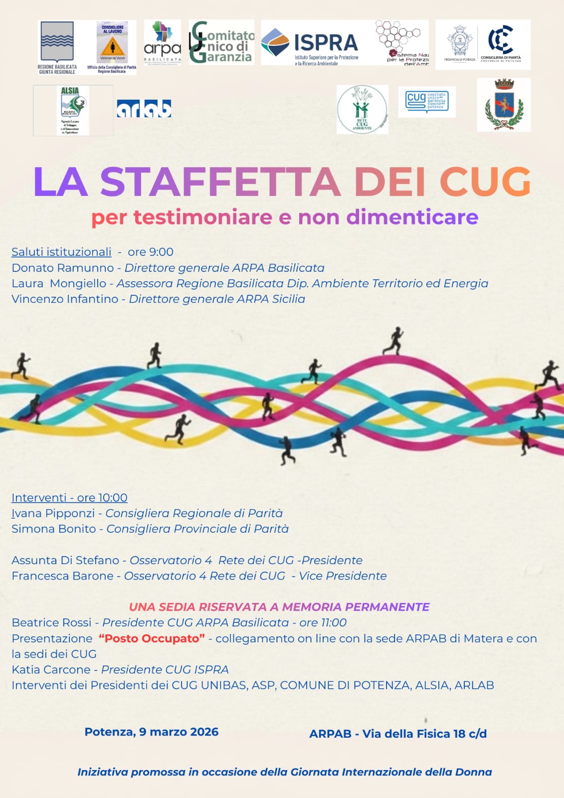 La Staffetta dei Cug, serie di appuntamenti promossa dai Comitati unici di garanzia di Ispra e delle Arpa/Appa, è approdata a Potenza in prossimità della Giornata internazionale delle donne. Un incontro per testimoniare e non dimenticare a cui hanno preso parte stamattina Laura Mongiello, assessore all’Ambiente della Regione Basilicata, i direttori generali di Arpa Basilicata e di Arpa Sicilia, Donato Ramunno e Vincenzo Infantino, la presidente e la vicepresidente della Rete Cug Snpa, Assunta Di Stefano (Arpa Sicilia) e Francesca Barone (Arpa Campania), oltre a molti altri colleghi e colleghe dell’Arpa Basilicata, dell’intero Snpa e delle istituzioni lucane.