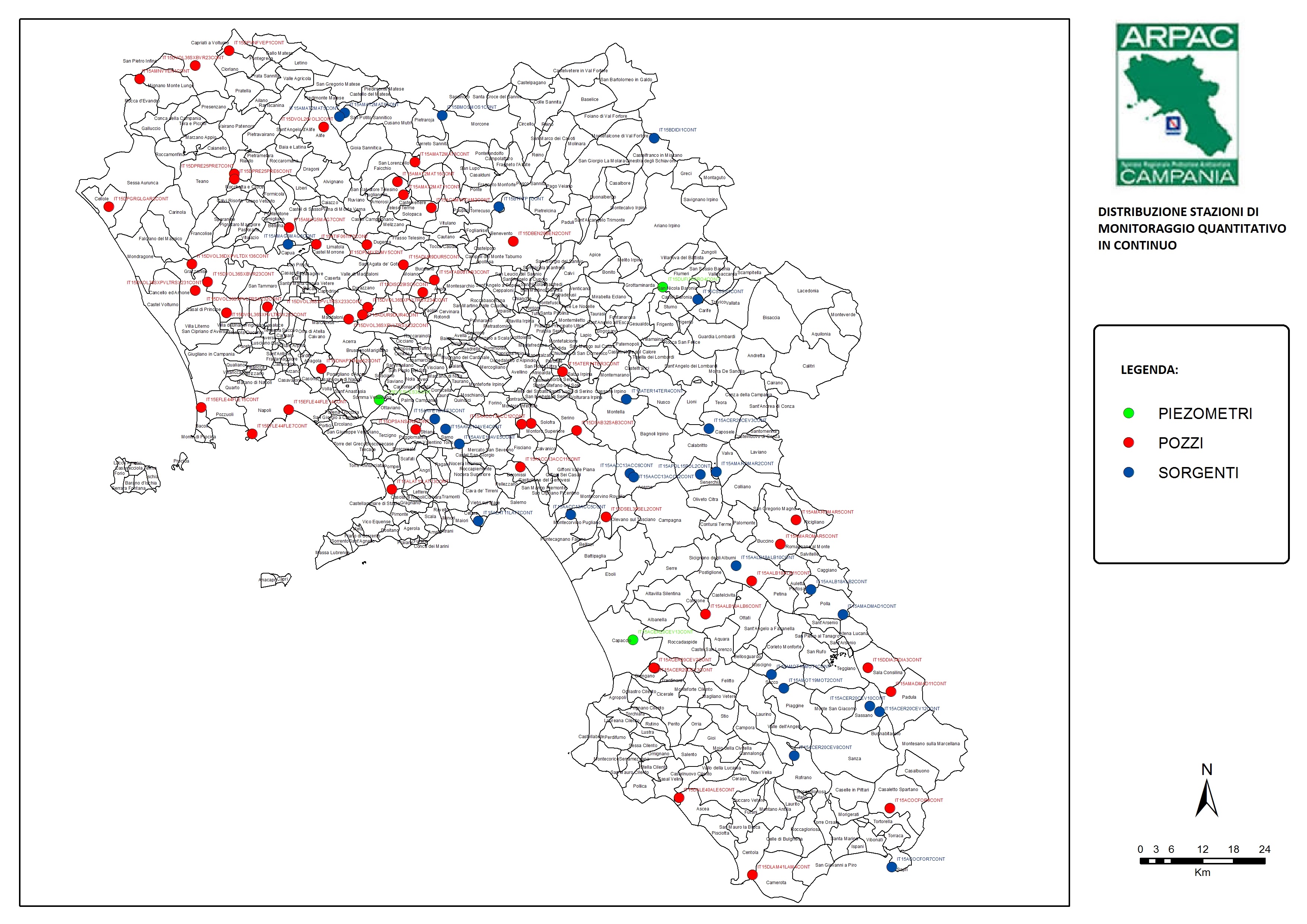 Nel 2002 il monitoraggio riguardava 40 corpi idrici sotterranei principali, successivamente ampliati a 49 corpi idrici “significativi”, come individuati dal Piano di Tutela delle Acque della Regione Campania (PTA) adottato nel 2007, in attuazione dell’art. 121 del D.Lgs. 152/2006. In corrispondenza di ciascun corpo idrico sotterraneo, ARPAC ha individuato siti di campionamento (stazioni di monitoraggio) rappresentativi — pozzi e sorgenti perenni — rispondenti ai requisiti previsti per le reti di monitoraggio chimico dall’Allegato 3 alla Parte Terza del D.Lgs. 152/2006.