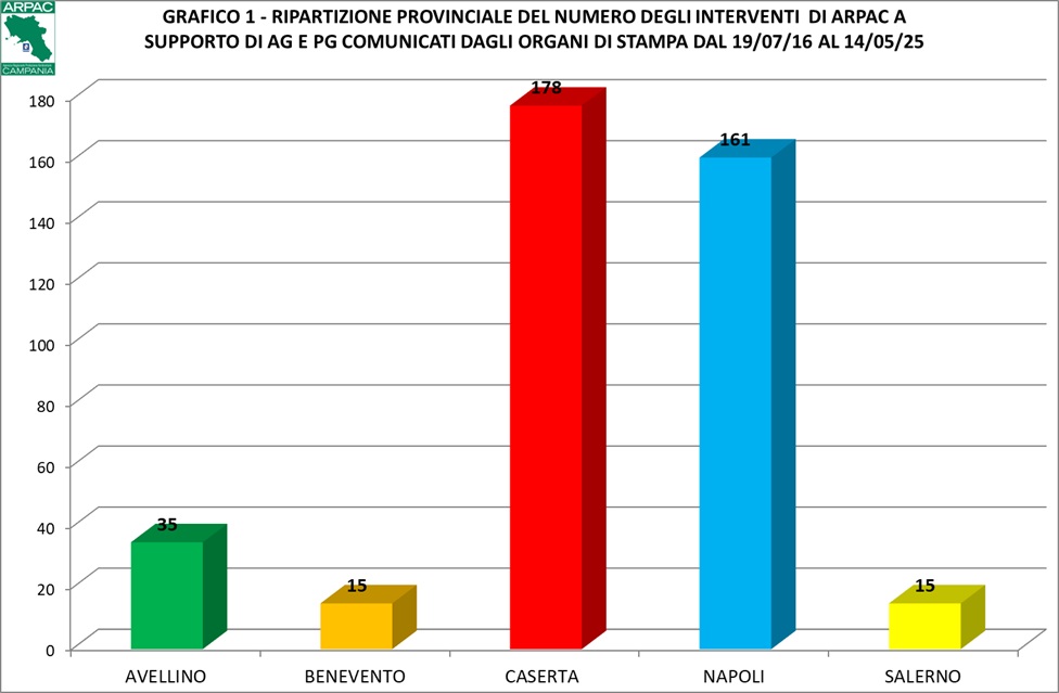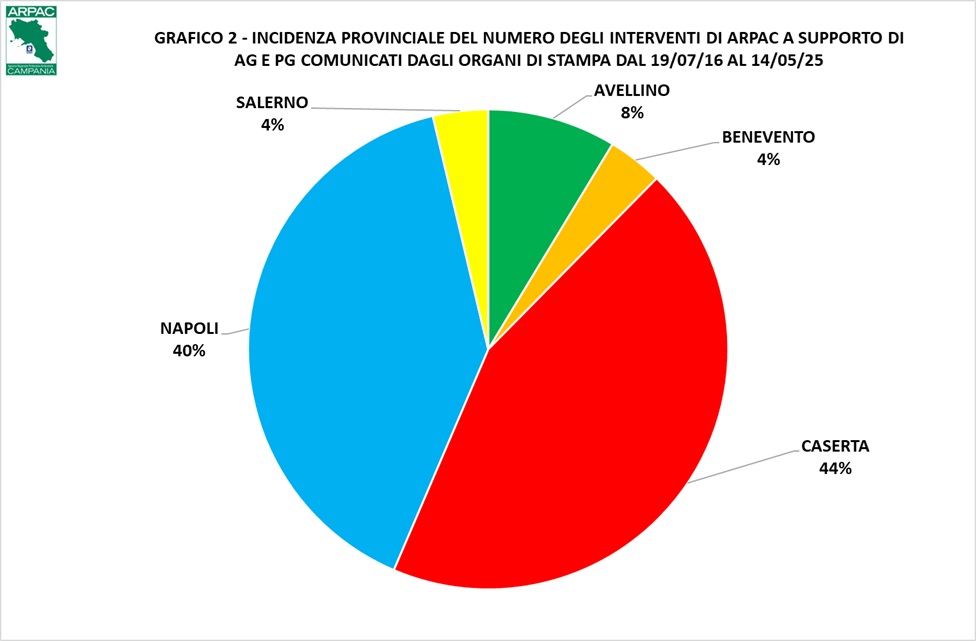 I dati innanzi rappresentati, relativi ai comunicati diffusi a mezzo stampa, si completano con quelli trasmessi dai Dipartimenti Provinciali Arpac, in ordine a tutte le numerosissime attività svolte dal personale agenziale, su richiesta dell’Autorità Giudiziaria o dalla Polizia Giudiziaria. Rispetto ai dati riportati dagli organi di stampa, queste informazioni evidenziano una prevalenza di interventi eseguiti nella provincia Napoli (36%), un sostanziale equilibrio di quelli eseguiti nelle province di Caserta (24%) e Salerno (25%); seguono le province di Avellino (10%) e Benevento (5%).