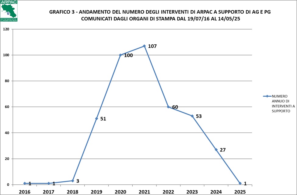 In questa pagina del sito web, cliccando sul menù posizionato in alto a destra organizzato per province, è possibile accedere ai singoli comunicati stampa, alle relazioni e ai materiali multimediali, pubblicamente diffusi dalle Autorità Giudiziarie, dalle Forze di P.G. e dagli organi di protezione civile relativi alle attività a cui in cui ARPAC ha fornito il supporto tecnico. Questa enorme quantità di dati ed informazioni è stata schematizzata e sintetizzata in una tabella consultabile e scaricabile al seguente link.