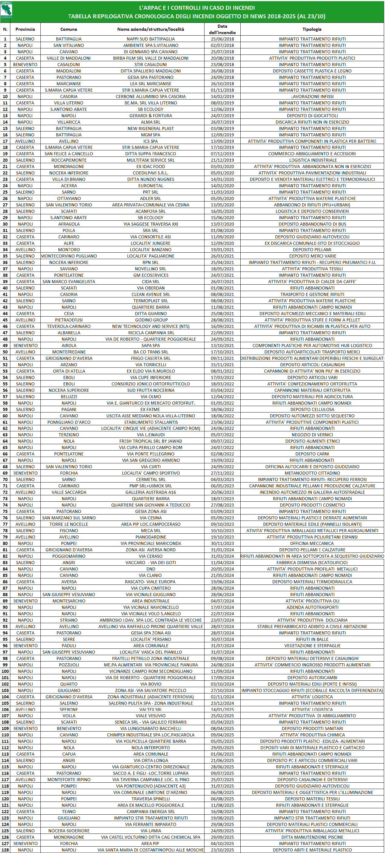 Come è ben noto, nel biennio 2017/2018, in Campania e in tutto il territorio nazionale, si è avuta una preoccupante impennata di incendi che hanno riguardato, in particolare, gli impianti autorizzati alla gestione dei rifiuti.