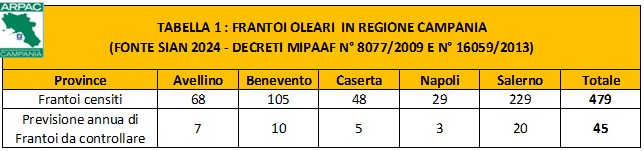 Le attività di controllo, effettuate dall’Agenzia sui frantoi, sono sintetizzate nelle seguenti tre tabelle descrittive. Nella tabella 1 sono indicati il numero di frantoi oleari censiti per ogni provincia (fonte dati Portale dell’Olio d’oliva del Sistema Informativo Agricolo Nazionale, SIAN anno 2024) e il numero di controlli annuali mediamente effettuati. Essi comprendono anche quelli che l’ARPAC, eventualmente, effettua su richiesta di Enti Territoriali o dell’Autorità Giudiziaria per specifiche criticità che possono rendere necessaria anche l’esecuzione di campionamenti e successive analisi di acque superficiali, per verificarne l’eventuale stato di inquinamento