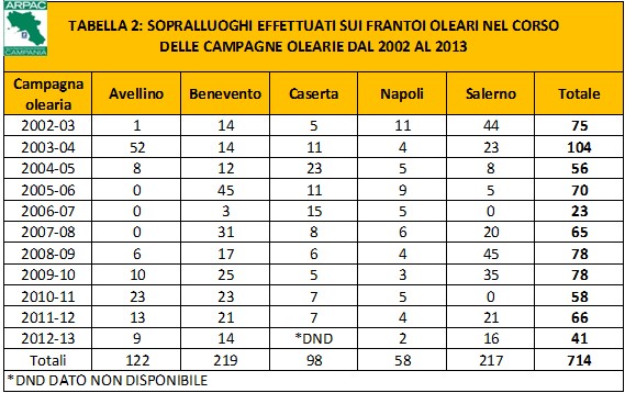 Nella tabella 2 che segue è evidenziato un estratto di un dato storico relativo al numero di frantoi controllati a partire dalla campagna olearia 2002-2003 fino alla campagna 2012-2013