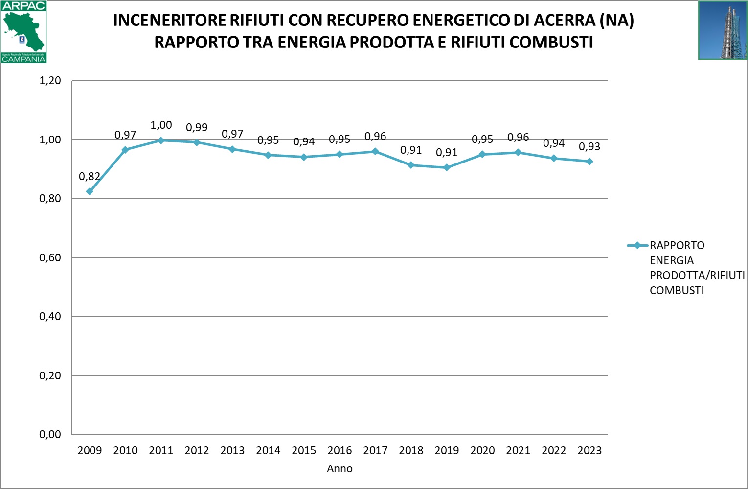 Presso l’Inceneritore di Acerra a partire dal 2009 e fino al 2023 (ultimo dato disponibile periodicamente oggetto di aggiornamento), dall’analisi dei dati disponibili, forniti dalla Sezione Regionale del Catasto Rifiuti dell’ARPAC, sulla base dell’analisi dei dati provenienti sia dai Modelli Unici di Dichiarazione (MUD) sia dall’Osservatorio Rifiuti SOvraregionale (ORSO), si evince come, in circa 14 anni di attività l’impianto ha bruciato 9.827.192 tonnellate di rifiuti, producendo oltre 9 milioni di MW/h di energia elettrica. Questo è avvenuto con un rapporto tra energia prodotta (MWh) e rifiuti combusti (Tonnellate) quasi costantemente superiore a 0,90 (con una media di 0,95) e molto prossimo all’unità in termini di recupero energetico. A titolo semplificativo basti pensare che per produrre 1 Kw/h di energia elettrica è stato necessario bruciare mediamente circa 1 Kg di rifiuti. Di seguito nei grafici n.1 e n.2 sono evidenziati chiaramente tali dati.