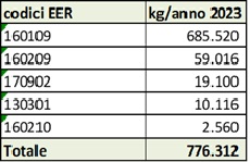 Per quanto riguarda la tipologia dei rifiuti, il codice EER più rappresentato nel 2023 è 160109 (685.520 kg), seguito da 160209 (59.016 kg). Anche in questo caso, i quantitativi risultano molto variabili da un anno all'altro in base alle attività di smaltimento programmate.