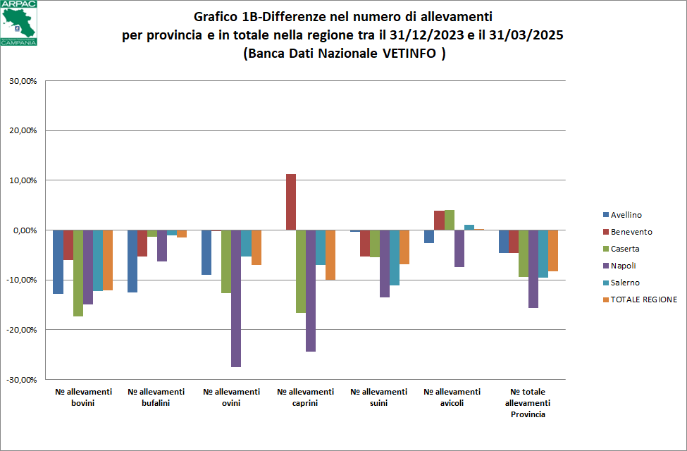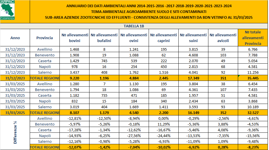 Nel ricco quadro nazionale la zootecnia campana si caratterizza per l'elevato numero di capi ed aziende bufaline, che si concentrano soprattutto nelle provincie di Caserta e Salerno , in aziende agricole spesso di tipo intensivo o in allevamenti "senza terra". Queste peculiarità e la conseguente forte concentrazione di animali in determinati comprensori fanno sì che, in regione Campania, la fertirrigazione attuata con reflui zootecnici, sia una pratica alquanto diffusa ma rischiosa per l'ambiente. Tenendo conto dei coefficienti di produzione riportati in letteratura, si stima (fonte Assessorato Agricoltura – gennaio 2013) che ogni anno si producono sul territorio regionale 3.795.530 m di liquami zootecnici che per la maggior parte sono utilizzate per fini agronomici. Nelle tabelle 1A ed 1B sottostanti, compilate con i dati estratti dalla Banca Dati Nazionale del settore veterinario aggiornati al 31/03/2025, si evince chiaramente quali siano state le variazioni, sia in termini di numero di capi allevati sia in termini di aziende di allevamento, dal mese di Dicembre 2023 al mese di Marzo 2025. Questa analisi (con i relativi andamenti) risulta ancora più chiara dai successivi grafici 1A ed 1B