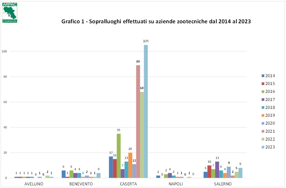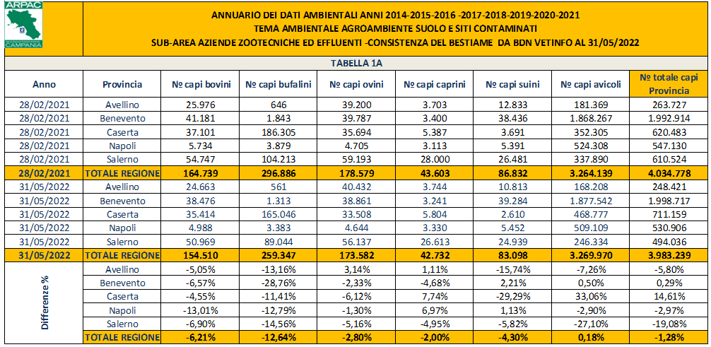 Nel ricco quadro nazionale la zootecnia campana si caratterizza per l'elevato numero di capi ed aziende bufaline, che si concentrano soprattutto nelle provincie di Caserta e Salerno , in aziende agricole spesso di tipo intensivo o in allevamenti "senza terra". Queste peculiarità e la conseguente forte concentrazione di animali in determinati comprensori fanno sì che, in regione Campania, la fertirrigazione attuata con reflui zootecnici, sia una pratica alquanto diffusa ma rischiosa per l'ambiente. Tenendo conto dei coefficienti di produzione riportati in letteratura, si stima (fonte Assessorato Agricoltura – gennaio 2013) che ogni anno si producono sul territorio regionale 3.795.530 m di liquami zootecnici che per la maggior parte sono utilizzate per fini agronomici. Nelle tabelle 1A ed 1B sottostanti, compilate con i dati estratti dalla Banca Dati Nazionale del settore veterinario aggiornati al 31/12/2023, si evince chiaramente quali siano state le variazioni, sia in termini di numero di capi allevati sia in termini di aziende di allevamento, dal mese di Maggio 2022 al mese di Dicembre 2023. Questa analisi (con i relativi andamenti) risulta ancora più chiara dai successivi grafici 1A ed 1B