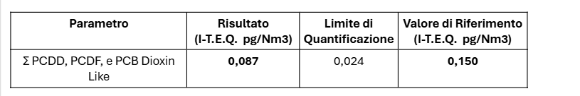 In esito al monitoraggio svolto la concentrazione complessiva di diossine, furani, policlorobifenili diossina-simili è risultata inferiore al valore di riferimento correntemente utilizzato dalla comunità scientifica  (fonte: LAI, Germania, 2004).