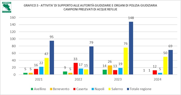 I dati innanzi rappresentati, relativi ai comunicati diffusi a mezzo stampa, si completano con quelli trasmessi dai Dipartimenti Provinciali Arpac, in ordine a tutte le numerosissime attività svolte dal personale agenziale, su richiesta dell’Autorità Giudiziaria o dalla Polizia Giudiziaria. Rispetto ai dati riportati dagli organi di stampa, queste informazioni evidenziano una prevalenza di interventi eseguiti nella provincia Napoli (36%), un sostanziale equilibrio di quelli eseguiti nelle province di Caserta (24%) e Salerno (25%); seguono le province di Avellino (10%) e Benevento (5%).