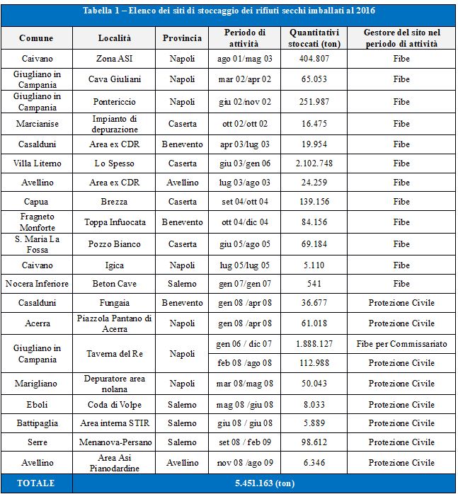 Il Governo italiano, con D.L. n. 185 del 25.11.2015, convertito in Legge con modificazione, n. 9 del 22 gennaio 2016, ha stabilito, ai sensi dell’art. 2 del citato Decreto legge, che il Presidente della Regione Campania dovesse predisporre un piano straordinario di interventi finalizzato, tra le altre cose “…allo smaltimento, ove occorra anche attraverso la messa in sicurezza permanente in situ, dei rifiuti in deposito nei diversi siti della Regione Campania risalenti al periodo emergenziale 2000/2009 e comunque non oltre il 31 dicembre 2009…”. La Regione Campania per attuare quanto previsto dal DL del Governo italiano, attraverso Delibere di Giunta (DGR n. 609 del 26/11/2015 e DGR n. 828 del 23/12/2015), ha adottato un piano stralcio operativo di interventi di rimozione, trasporto e smaltimento in ambito comunitario e/o recupero in ambito nazionale o comunitario di rifiuti imballati e stoccati presso otto siti ricompresi nei territori delle 5 province della regione, per un totale di circa 800.000 tonnellate e con successivo decreto, n. 115 del 24/12/2015, sono stati approvati gli atti di gara per la realizzazione del piano stralcio di cui all’art. 2 del citato Decreto Legge. I siti oggetto delle attività di cui al piano stralcio precedente sono riportati nella successiva tabella 2
