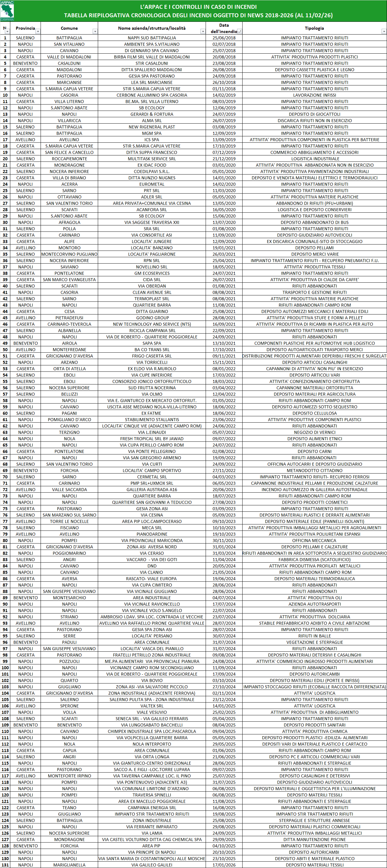Come è ben noto, nel biennio 2017/2018, in Campania e in tutto il territorio nazionale, si è avuta una preoccupante impennata di incendi che hanno riguardato, in particolare, gli impianti autorizzati alla gestione dei rifiuti.