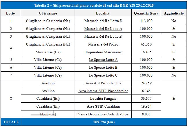 Degli otto lotti messi a gara sono stati aggiudicati (Decreto n. 39 del 15/04/2016) il 2, il 4, il 5, il 6 e l’8 riportati nella tabella 2, per un totale di circa 480.000 tonnellate di rifiuti da rimuovere. Il bando di gara indetto per gli interventi di rimozione, trasporto e smaltimento dei rifiuti stoccati ha previsto la caratterizzazione analitica degli stessi rifiuti da parte delle ditte aggiudicatarie e la Regione Campania – ai sensi dell’art. 5 del Capitolato Speciale di Appalto del bando di gara – ha stabilito di effettuare, attraverso ARPA Campania, attività di controllo durante lo svolgimento delle operazioni di campionamento in campo, nonché di caratterizzazione analitica, verificando la corretta applicazione delle metodiche di campionamento e validando i risultati analitici, sul 20% dei campioni esaminati. Con successiva DGR n. 5 del 10 gennaio 2017, la Regione Campania ha aggiornato il piano stralcio operativo di cui alla DGR n. 609 del 26/11/2015 e DGR n. 828 del 23/12/2015, così come riportato nella successiva tabella 3