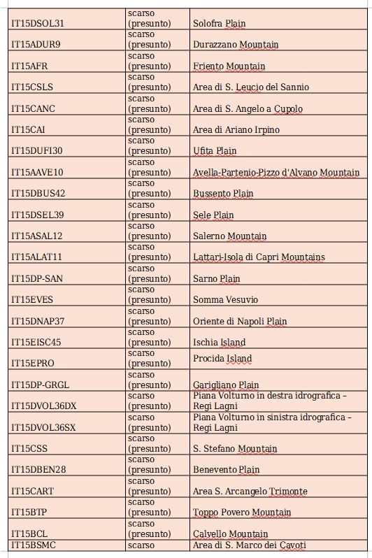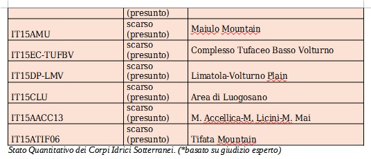 La classificazione quantitativa in Campania non è stata ancora pienamente definita con dati aggiornati. La Relazione del Piano di Gestione delle Acque – III Ciclo 2021–2027 (Distretto Appennino Meridionale) conferma provvisoriamente lo stato quantitativo delle acque sotterranee della Campania già indicato nel precedente ciclo di piano. In altri termini, lo stato quantitativo, già valutato come “presunto” nel Piano precedente (basato su dati 2014–2015 e su giudizio esperto), resta invariato. Gran parte dei corpi idrici sotterranei campani sono considerati in stato quantitativo “buono” (presunto buono in assenza di forti evidenze di over-exploitation), mentre solo alcuni acquiferi critici sono indicati a rischio di stato “scarso”.