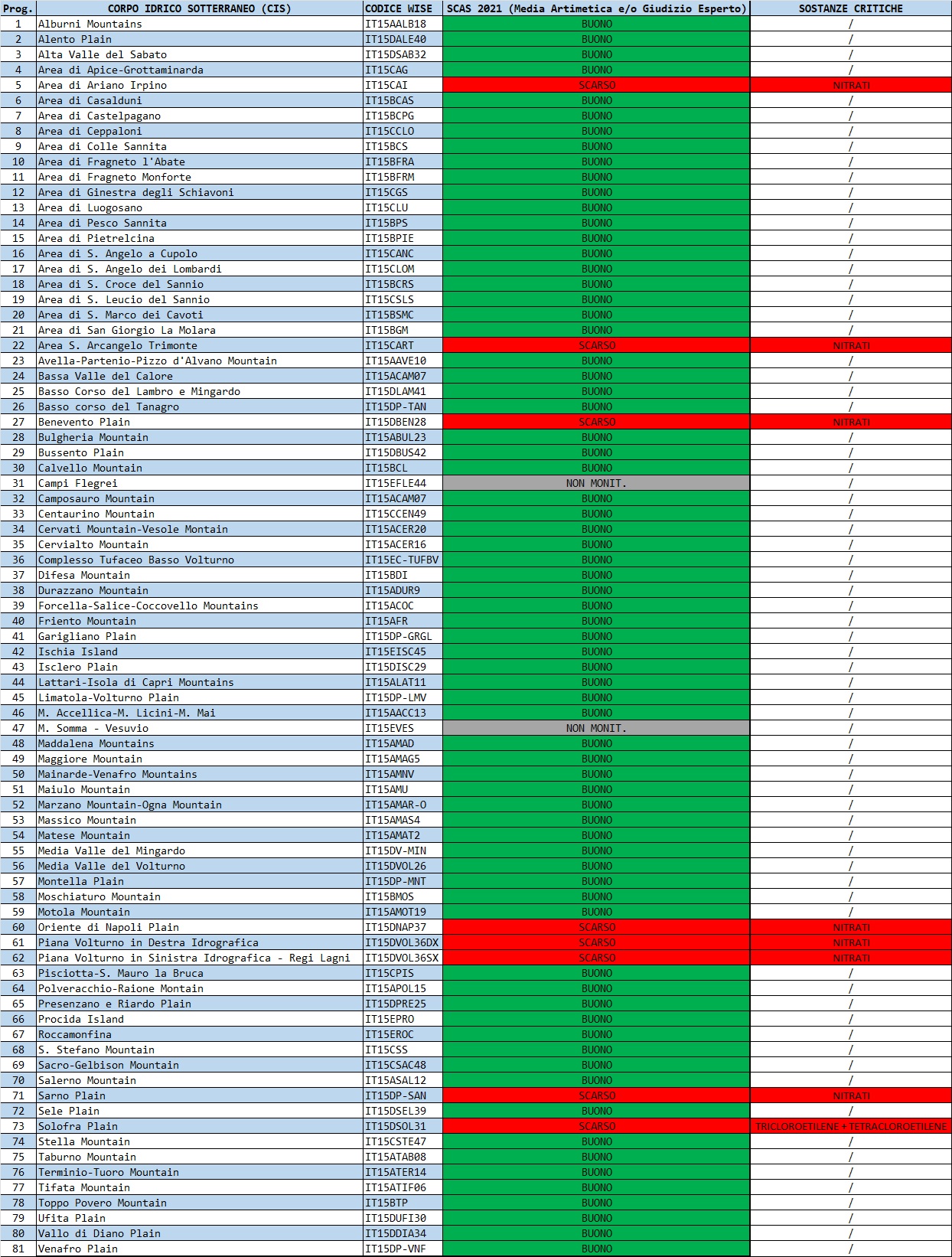 Di seguito sono riportale le mappe esplicative e le tabelle sintetiche degli esiti dello Stato Chimico annuale per ciascun corpo idrico sotterraneo della Campania relative all’attuale sessennio di riferimento per il monitoraggio 2021 - 2026