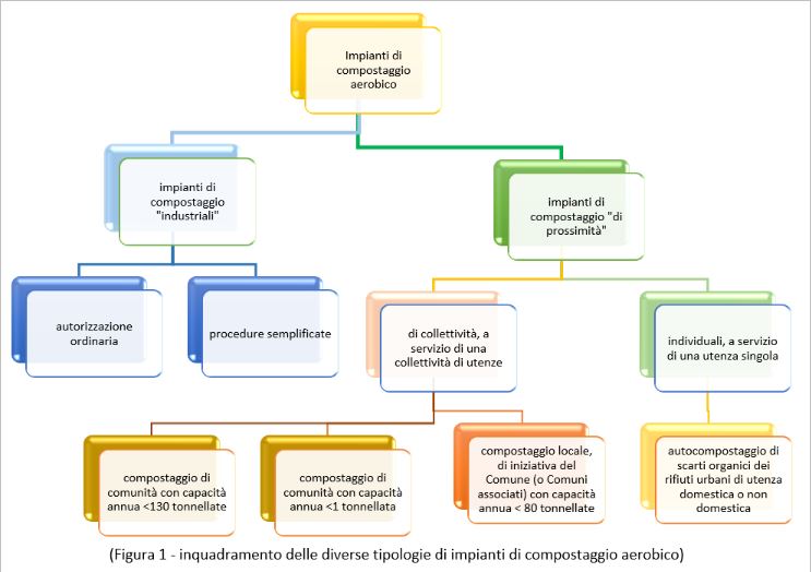 Ognuna delle tipologie definite come in precedenza si differenzia dalle altre per una ulteriore serie di aspetti, tra i quali si ricordano la norma di riferiferimento, l'iter autorizzativo, le quantità annue di rifiuto organico trattato, l'Autorità Competente (AC) che rilascia il titolo autorizzativo; nella tabella 1 si riporta la classificazione delle varie tipologie di compostaggio in base ad alcuni di questi specifici aspetti.
