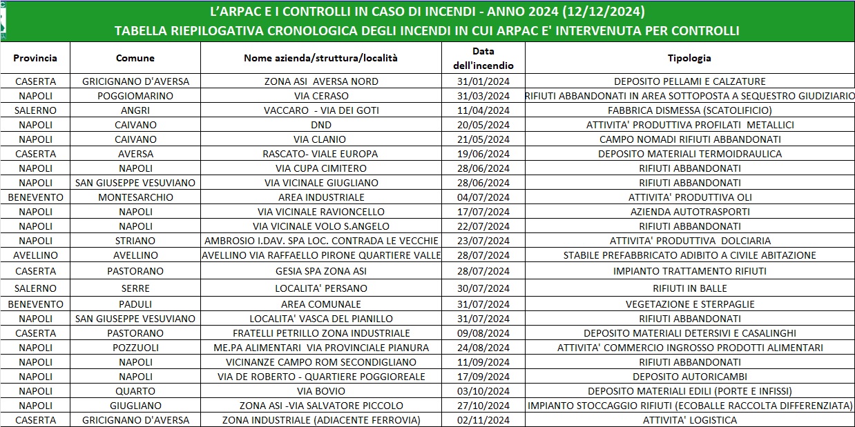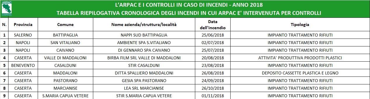 Nella tabella sotto riportata, che è possibile scaricare al seguente link, sono riportati in ordine cronologico le attività di controllo eseguite da ARPAC in occasioni di incendi in cui l’Agenzia è intervenuta a far data dal 2018 e che sono stati oggetto di pubblicazione nelle news.